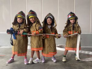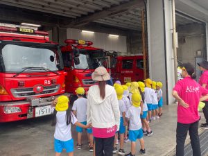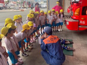 消防署に着いてからまず、消防車や救急車の中を見せてもらいました!長い消防車や車を壊す大きなハサミなど、子ども達は興味津々にみていました💕