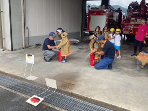 まずは、消防士さんの服やヘルメットを実際に着て消火器を使って消火訓練を行いました。