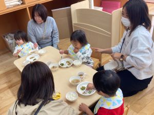 その後は、お部屋に戻ってみんなでお給食を食べました。スプーンを使って頑張って食べる