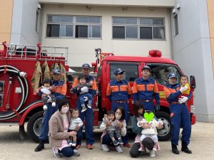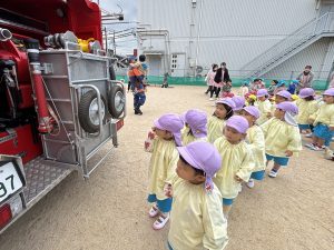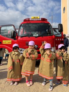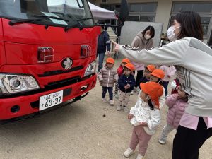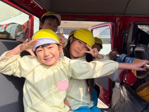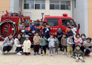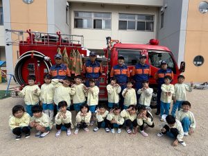 火災の避難訓練後、保育園に小郡消防団の方と消防車がきました。