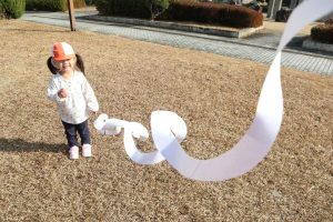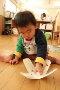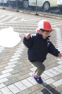りす組さんは、凧上げやコマあそびを楽しみました。戸外では、走りながら凧を腕をあげて揚げることが難しい様子でしたが、お友だちの風に揺れる凧の様子を見たり、とにかく一生懸命走ったり・・・。お部屋では、コマがくるくる回るところを見て何度も回して楽しそうにしていました!