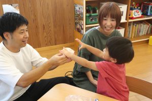 最初に、大好きなお父さん、お母さんと一緒にいつも園で楽しんでいる体操やふれあい遊びをしました。