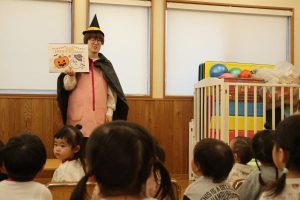 ハロウィンのお話を聞き、「おかしもらえるの?」と目を輝かせる子どもたち。