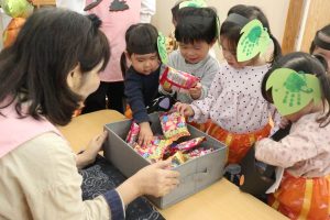 「見て~!」「可愛いでしょ」と嬉しそうにポーズを決め、園内をまわって「トリックオアトリート!」の合言葉でお菓子をもらいました。
