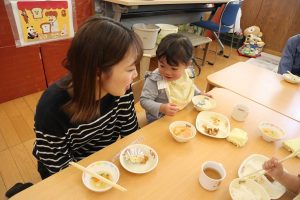 お給食も大好きなお母さん、お父さんと一緒に食べました!