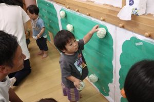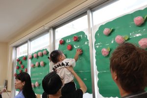 次は「くだもの狩り」。くだものを入れるかごにシール貼りをして・・