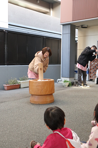 先生がお餅のつき方を見せます!「がんばれ~」「よいしょ!」などと掛け声をかけて応援しますよ(#^.^#)