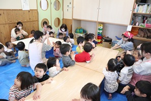 待つ間、もちつきの歌を歌ったり、紙芝居を見たりしました。