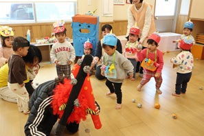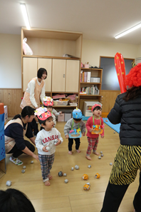 びっくりしてしまった子もいましたが・・頑張ってボールを投げ、「鬼は~外!!」鬼を退治する子もいました。